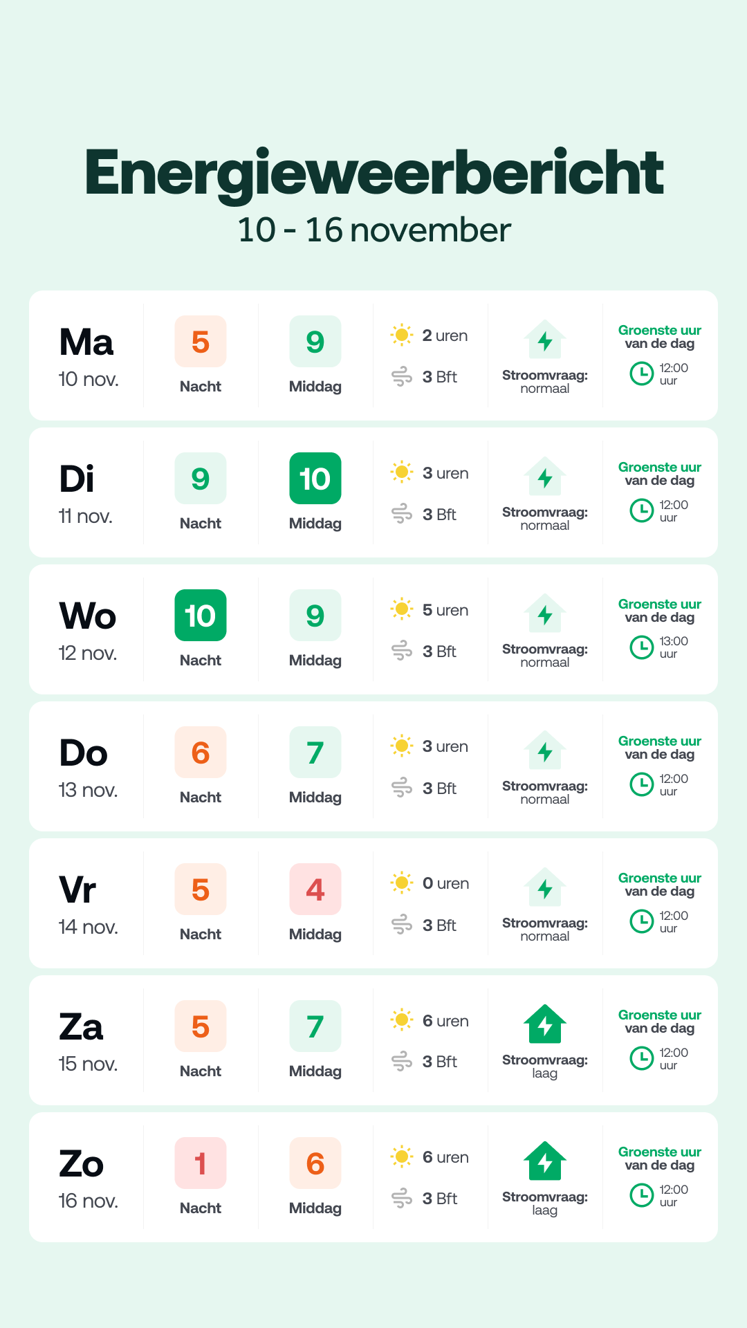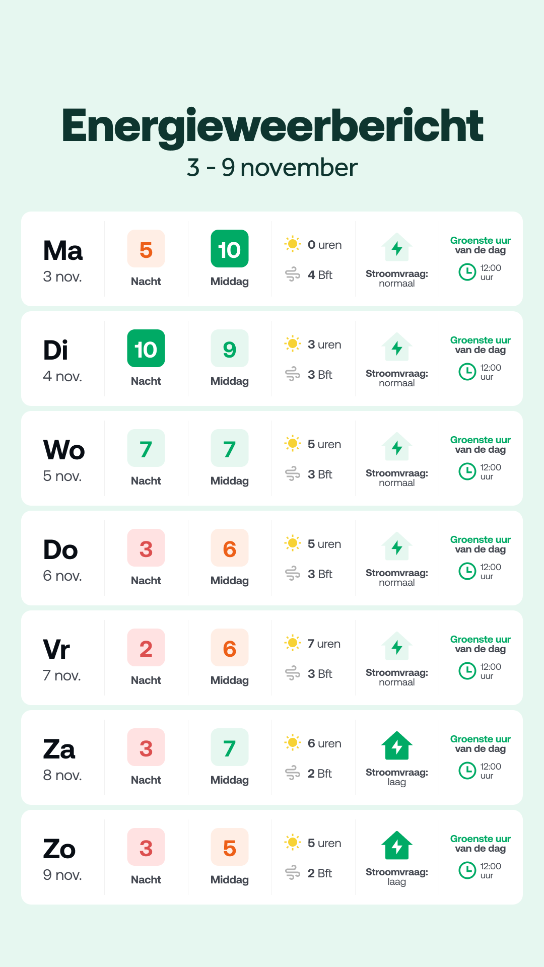 In heel 2024 kwam ruim 45% van alle elektriciteit in Nederland van de zon en de wind – tegenover 41% in 2023. In 2030 moet 70% van alle elektriciteit uit hernieuwbare bronnen komen en in 2050 moet dit 100% zijn. Dat betekent dat er in gigantisch tempo nog nieuwe windparken en zonnepanelen worden aangesloten. Juist door de hernieuwbare energiebronnen worden de prijzen lager. Op momenten met veel wind- en zonnestroom is de stroomprijs het laagst en soms zelfs negatief.