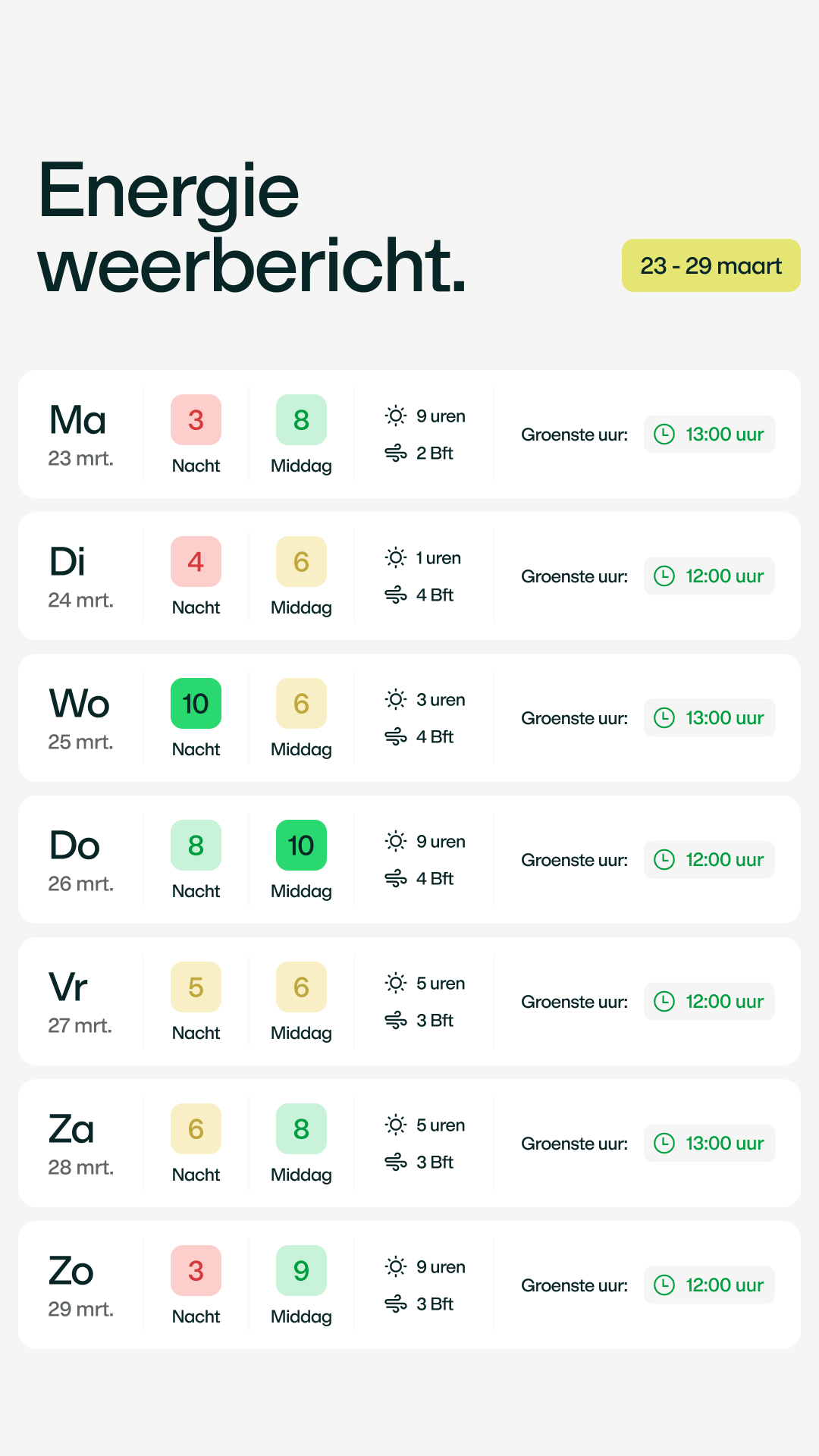 Onze tip: Gebruik je stroom donderdag. Omdat het dan ook iets meer waait, is er veel goedkope energie. Dit is hét moment om de wasmachine aan te zetten of je elektrische auto voordelig op te laden.ie.