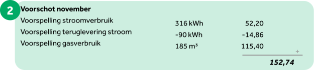 We verrekenen je werkelijke kosten van afgelopen maand met het voorschotbedrag dat je eerder al betaald hebt. Je ziet hier of je nog moet bijbetalen of geld terugkrijgt over afgelopen maand. In dit voorbeeld moet er nog worden bijbetaald.