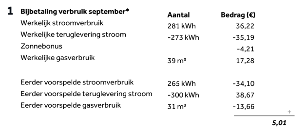 Klanten met zonnepanelen ontvangen van Zonneplan een extra bonus, de zonnebonus. Daarnaast zien zij hier ook hun teruglevering staan. Het eerder ontvangen voorschot staat hier als een positief bedrag. Wanneer het afgelopen maand minder zonnig was dan voorspeld, dan is er ook minder teruggeleverd, zoals in het voorbeeld. Wanneer je alle getallen bij elkaar optelt blijkt dat er nog € 5,01 moet worden bijbetaald.