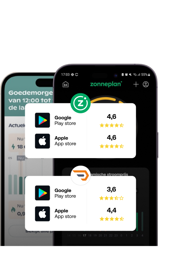 De Zonneplan App wordt beter gewaardeerd met een hoge 4,6/5 waardering in de app stores, terwijl EnergyZero achterblijft met een 4,0/5.