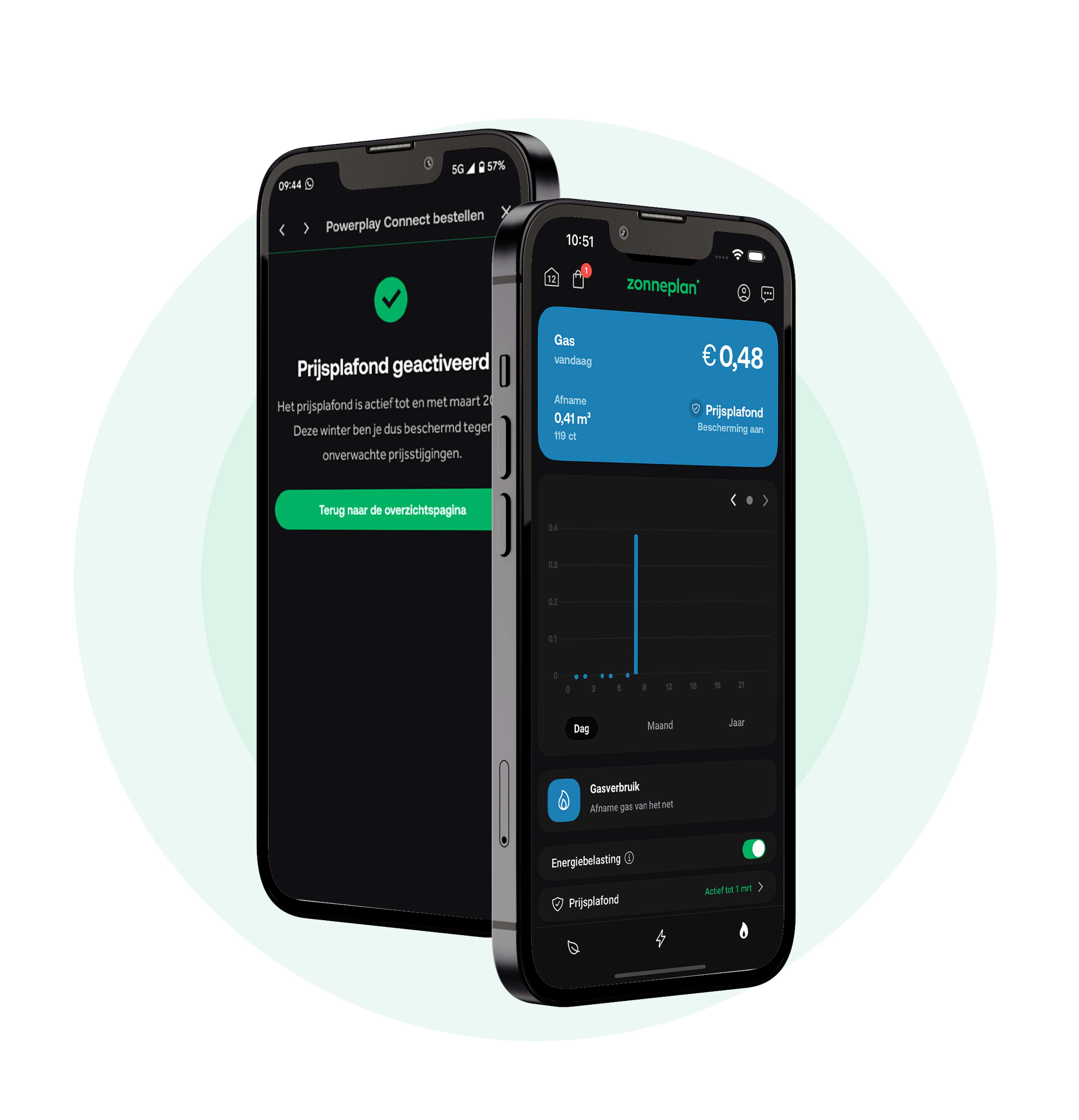 Dankzij de gratis Zonneplan Connect energiemeter heb jij altijd inzicht in je verbruik en kosten. Je prijsplafond bescherming activeer je zelf vanuit de Zonneplan app. In de app zie je elke dag de gasprijs en jouw gewogen gemiddelde prijs.