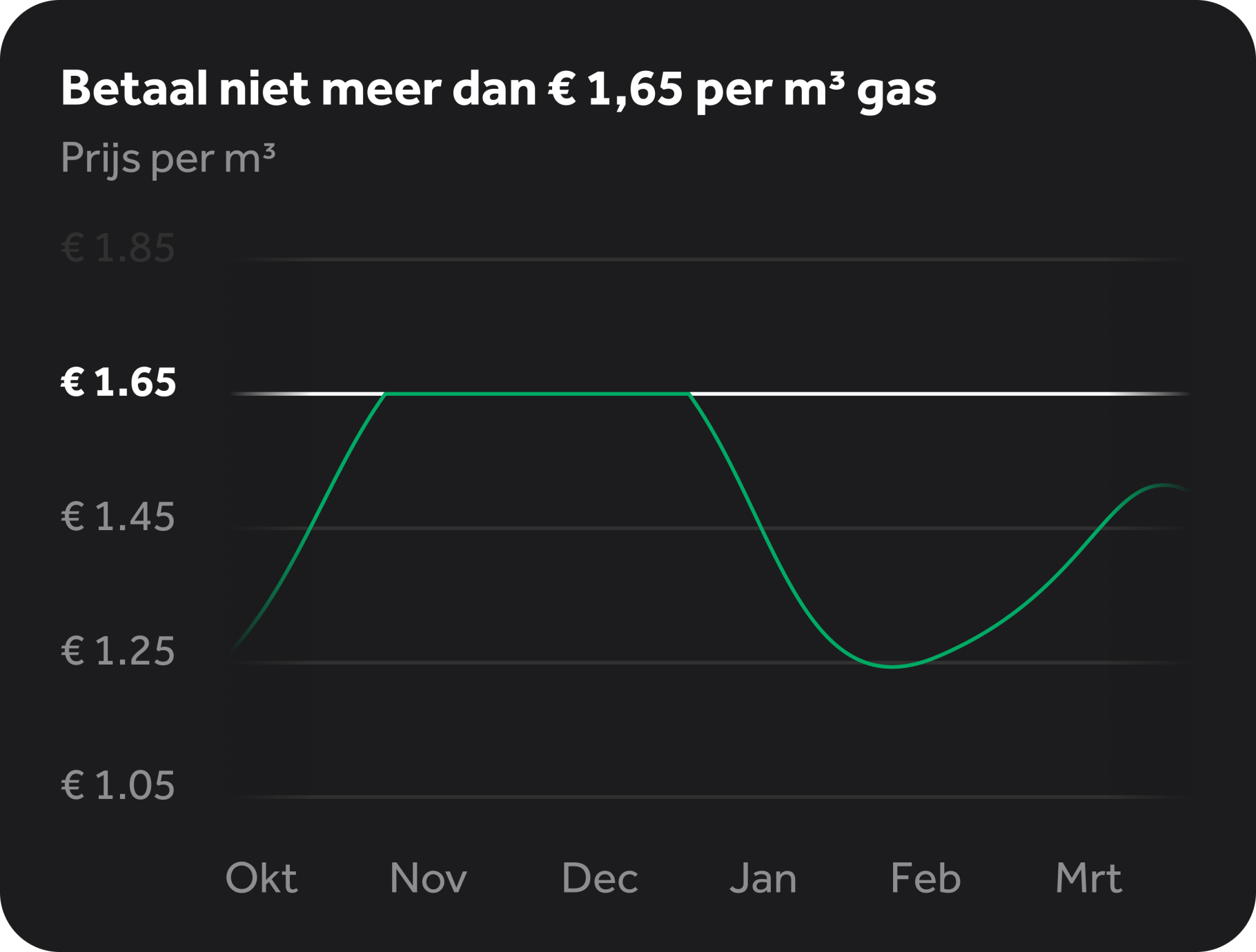 Bij een stijging van de gasprijs merk je dat ook direct. Jij draagt het risico zelf en bent op lange termijn altijd goedkoper uit. Toch kan dit spannend zijn. Daarom bieden we het Zonneplan prijsplafond. Een maximum gasprijs van € 1,65 per m³, voor wie graag zekerheid heeft.