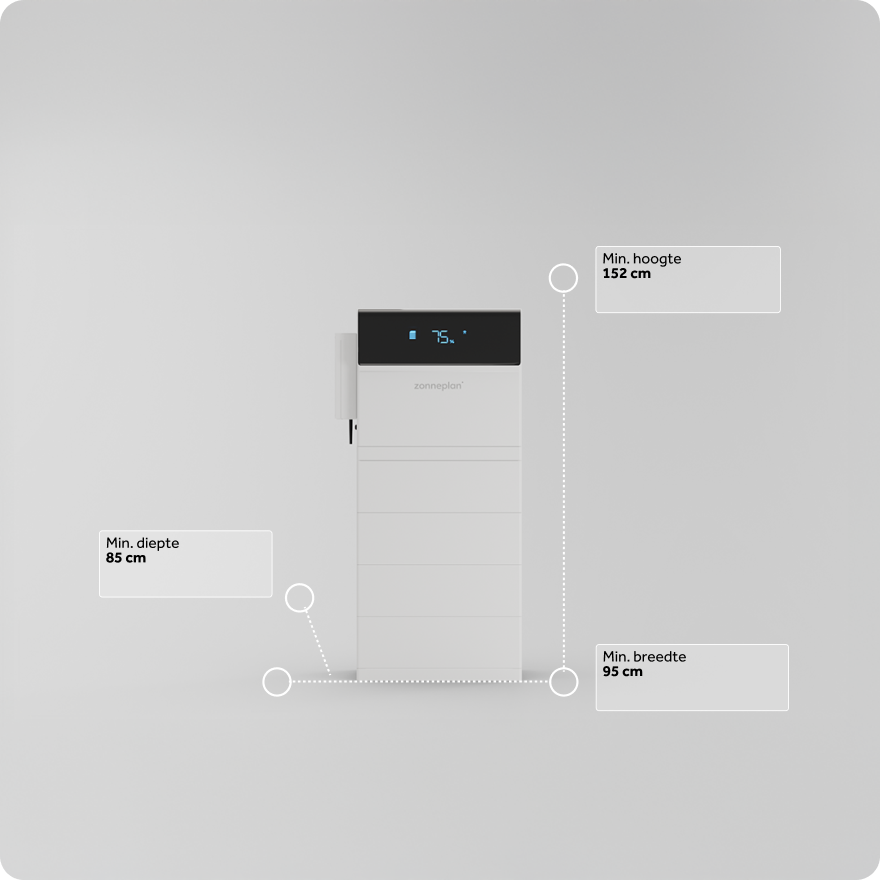 Onze monteurs komen in allerlei soorten huizen, groot én klein. Het komt zelden voor dat er echt geen plek is voor een thuisbatterij. Tegenwoordig zit de omvormer standaard in de thuisbatterij geïntegreerd. Voor de 20 kWh alles-in-één opstelling is wel voldoende vrije ruimte nodig in verband met ventilatie: houd rekening met 95 cm breed, 85 cm diep en minimaal 152 cm hoog.