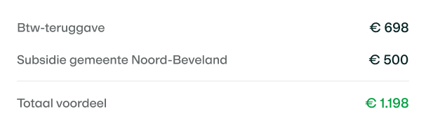 Woont u in de gemeente Noord-Beveland? Dan heeft u voordeel op twee punten. Als eerste de landelijke btw-teruggave waardoor u circa 21% btw retour krijgt vanuit de Belastingdienst. Als tweede de subsidie vanuit de gemeente Noord-Beveland van €500.