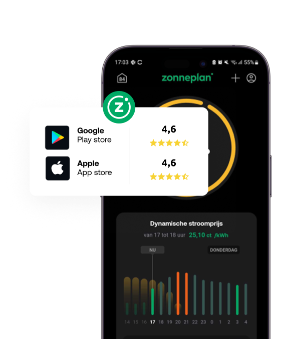 De app van Zonneplan scoort in de App Stores gemiddeld een 4,6 uit 5. Sessy heeft geen eigen app, maar werkt met een online portal (meetdatum: 29-04-2025).