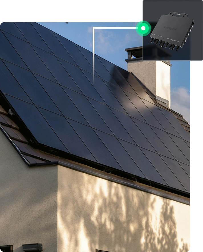 Geen omvormers of kabeltrajecten binnenshuis. Maar slim gemonteerd direct onder de panelen.
